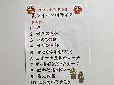 イベント会場に呉フォーク村のライブ紹介や今日の演奏曲等のポスターを飾ってくださってたり、まあ驚いた