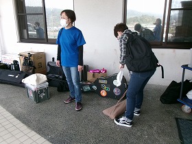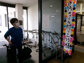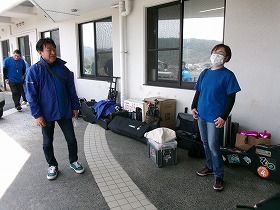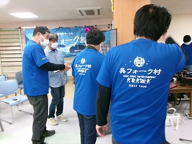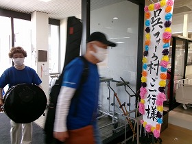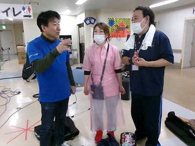 撤収作業を済ませ、機材を運ぶ前に、一本締め&ありがたきおもてなしグッズをみんなで手に持って、参加