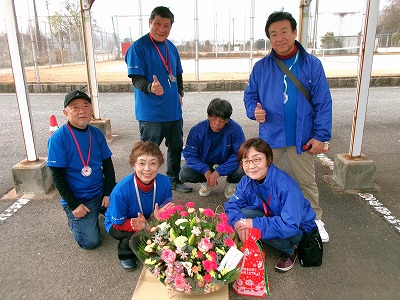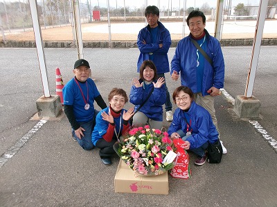 全員がいただいたメダルを首に掛けて、いただいたお花も持ってね!