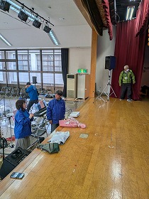 サロン世話人の方々が、機材搬入&会場セッティング(横断幕取付は石崎さん、活動軌跡ボードの設置は